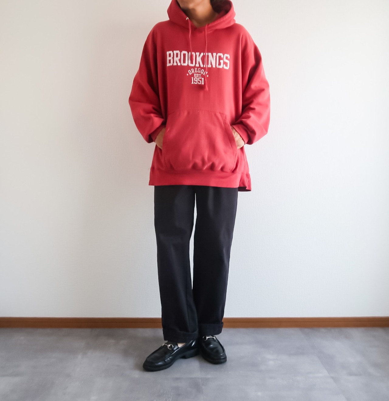 少しエンジみのあるレッド系のカラーリングに、フロントには4段のプリントがクールな一着です。