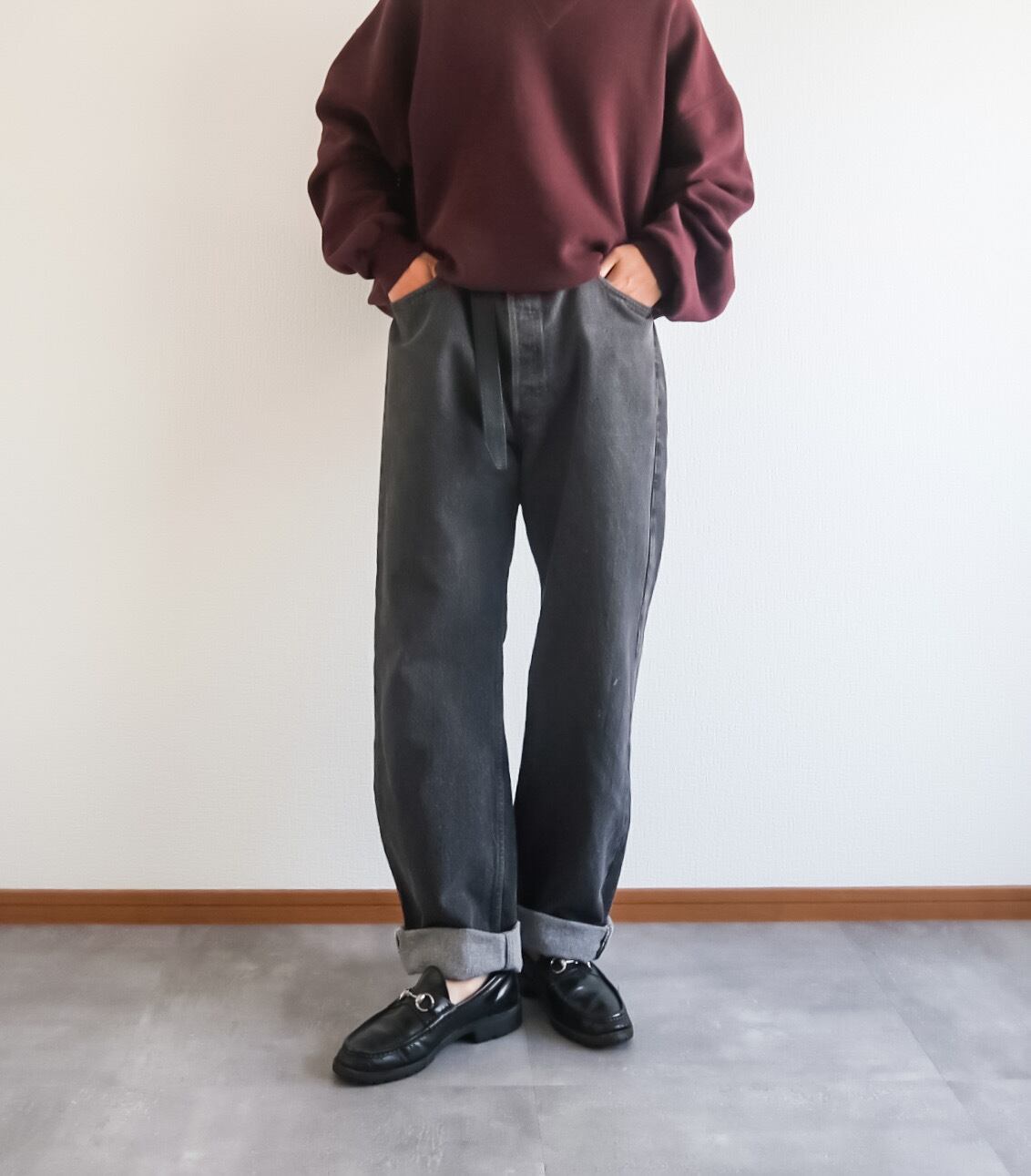 少し大きめですがベルトで絞ったシルエットは最高で、ジャストよりもこちらの方が気分な方も多いのではないでしょうか。