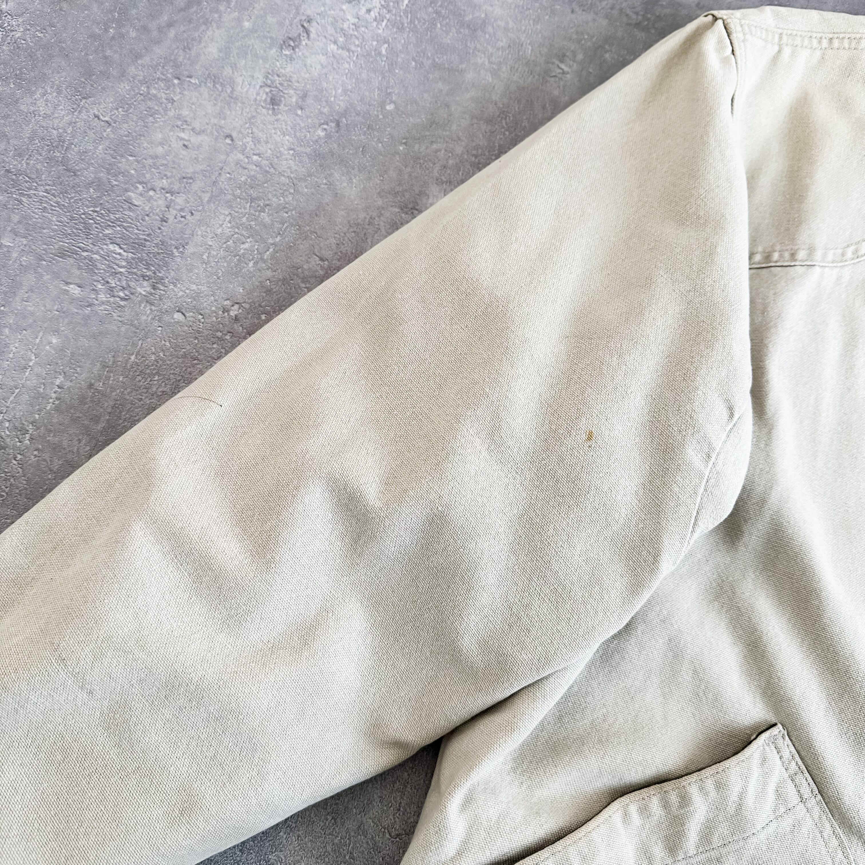 アイボリー系のカラーリングに、スラッシュとフラップ付き、ジップ付きのポケットや肩にパッチもある良ディテール。