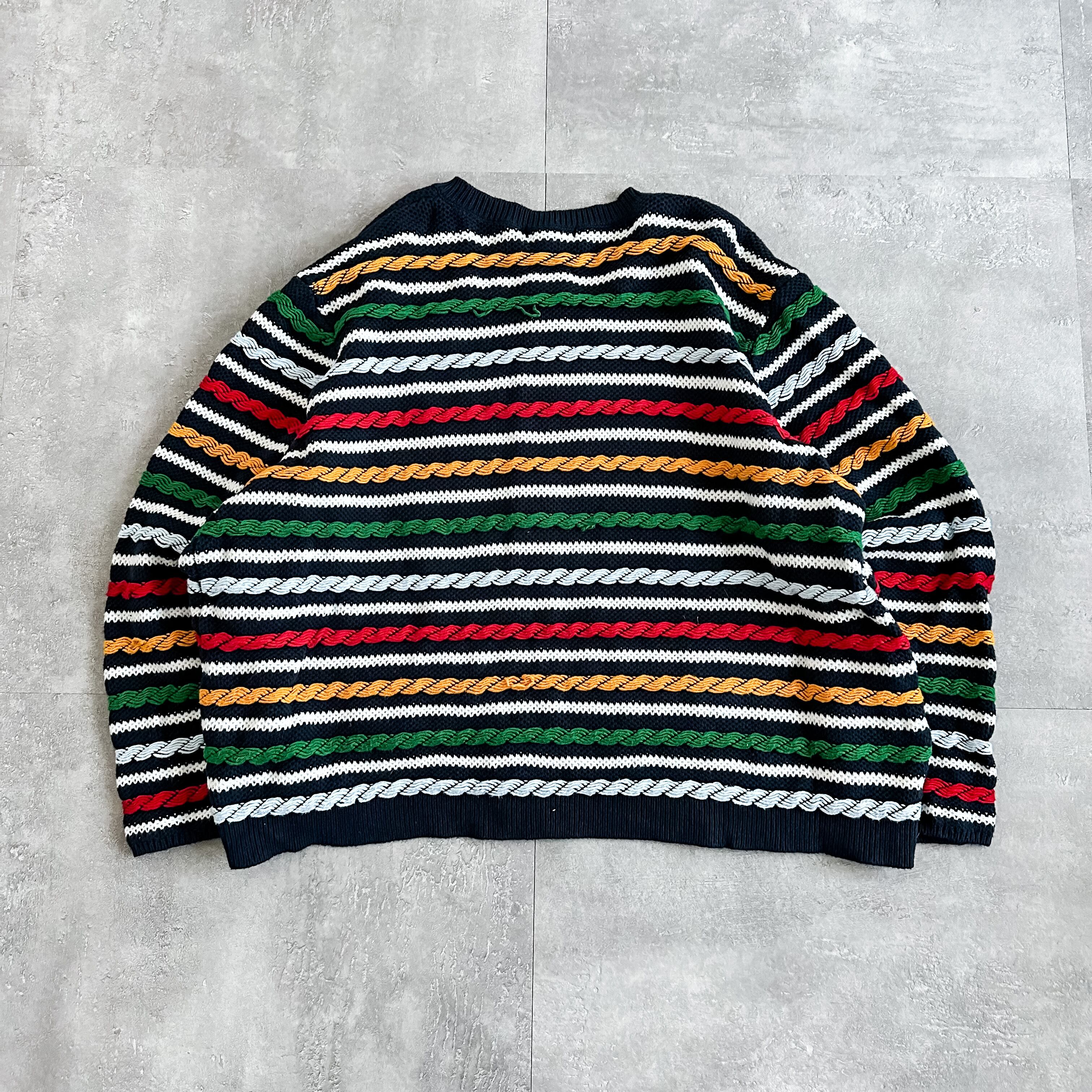 ネイビーとホワイトベースに、カラフルなケーブルがボーダー状に編まれた珍しいデザインです。