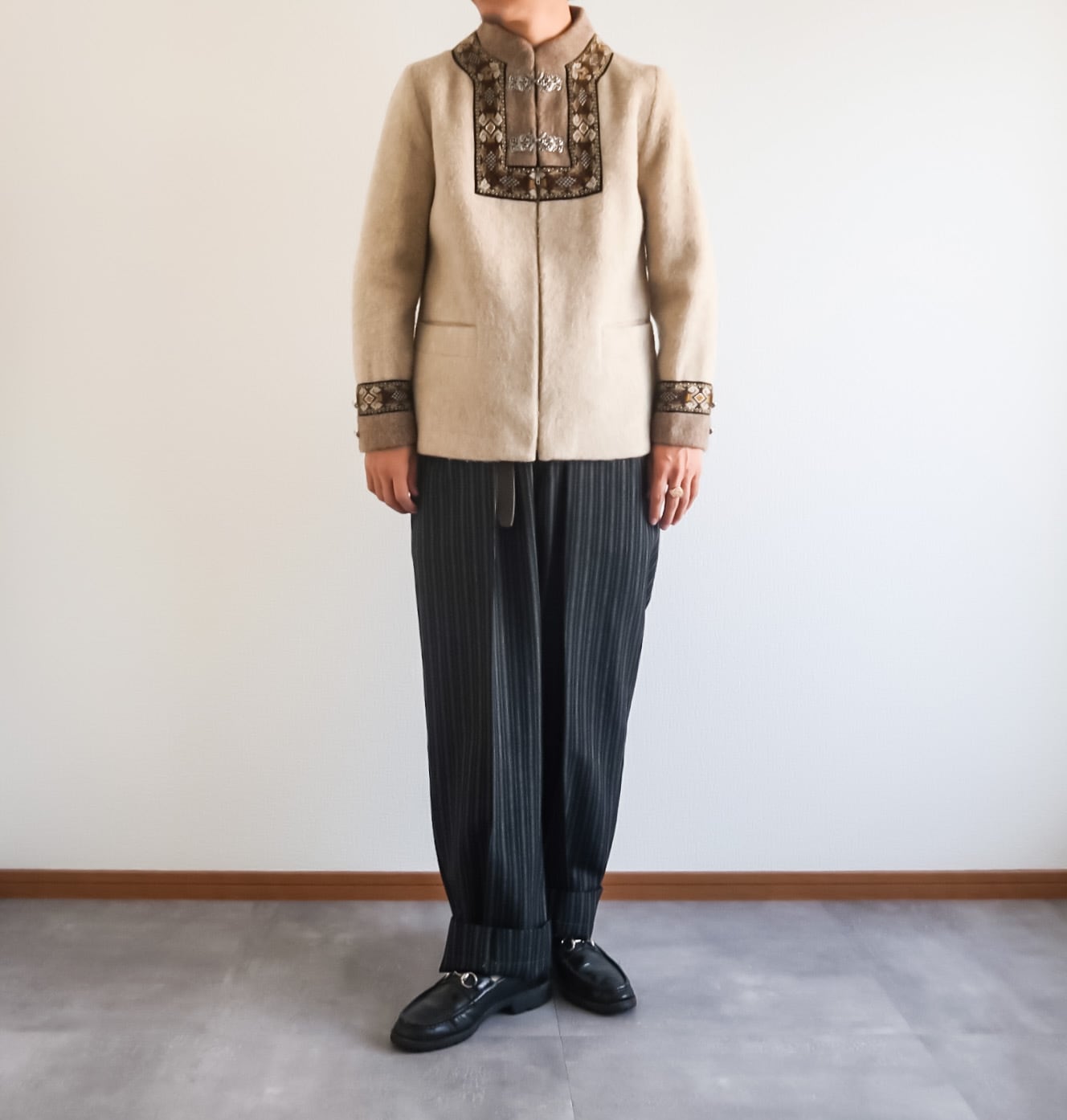ベージュとアイボリーが混ざったような絶妙なカラーをベースにブラウン系の切り替えやノルディック独特な柄が素晴らしい一着です。