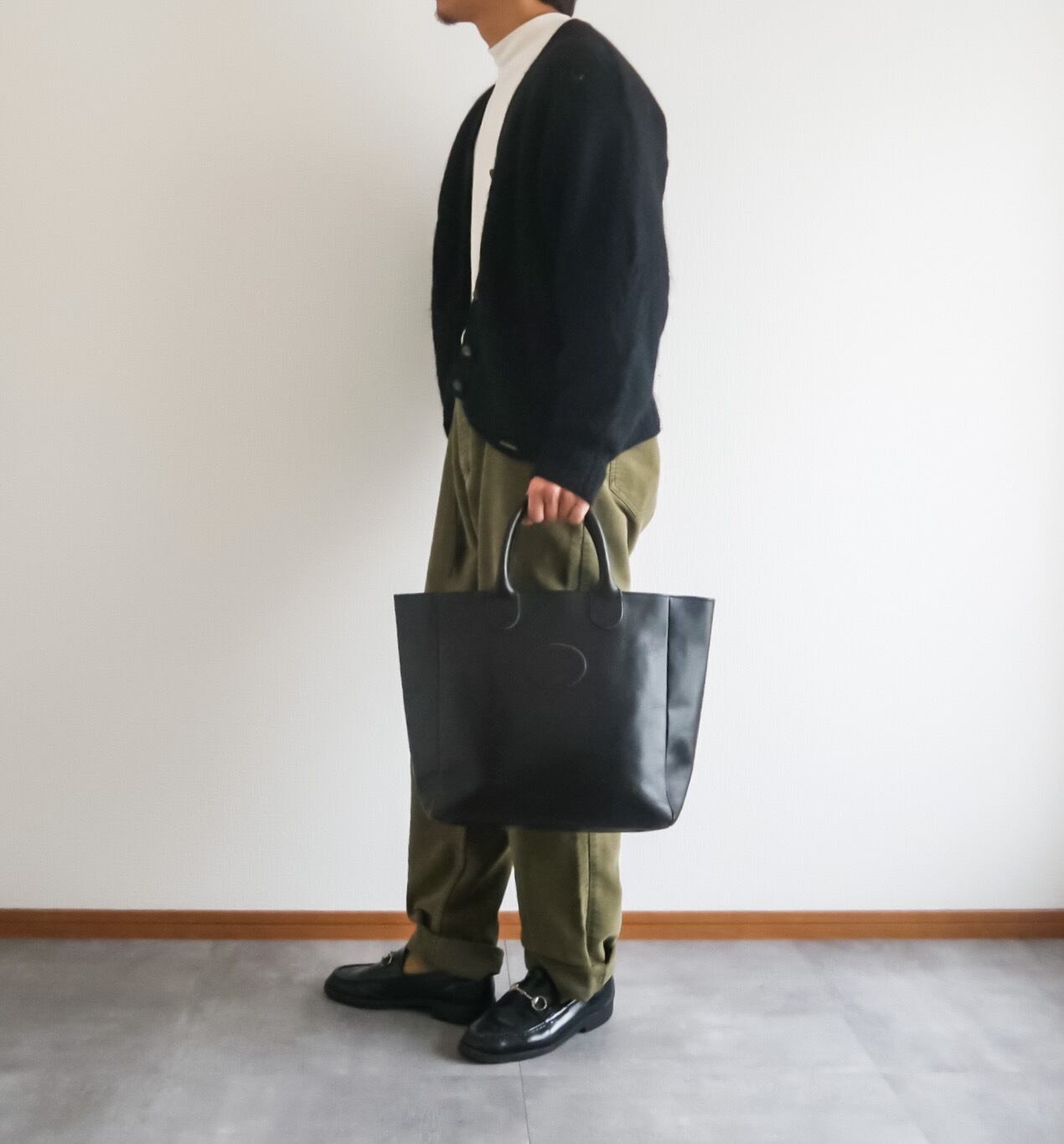 L.L.Beanを初めBROOKSTONEやG.H.BASSなどのブランドが近年人気ですが、その中でもブラックレザーのトートバッグはほとんど見かけないかと。