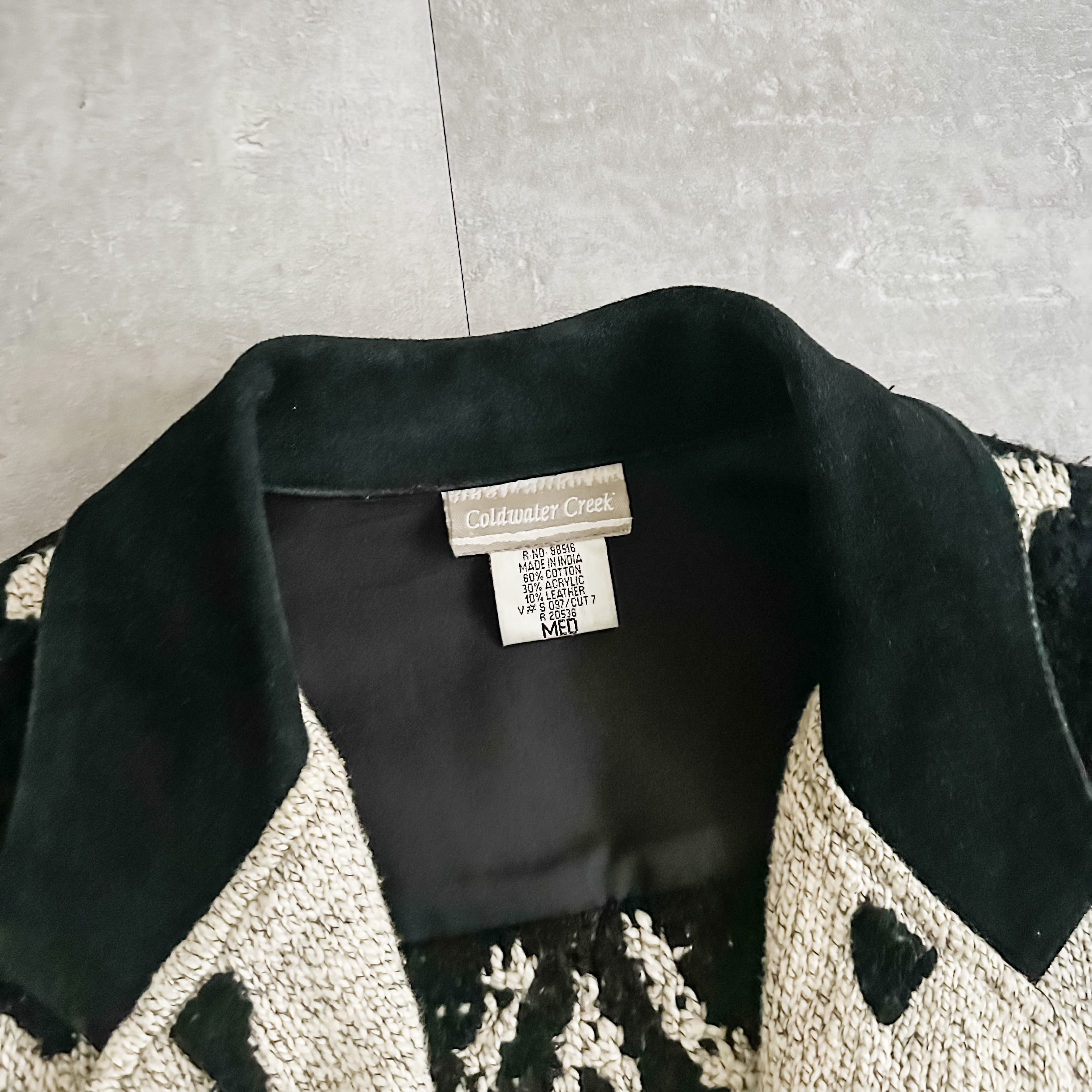 コットン×アクリルの混紡ファブリックのボディーに、襟とバックの上部がブラックのレザーに切り替わったグッドデザインな一枚。