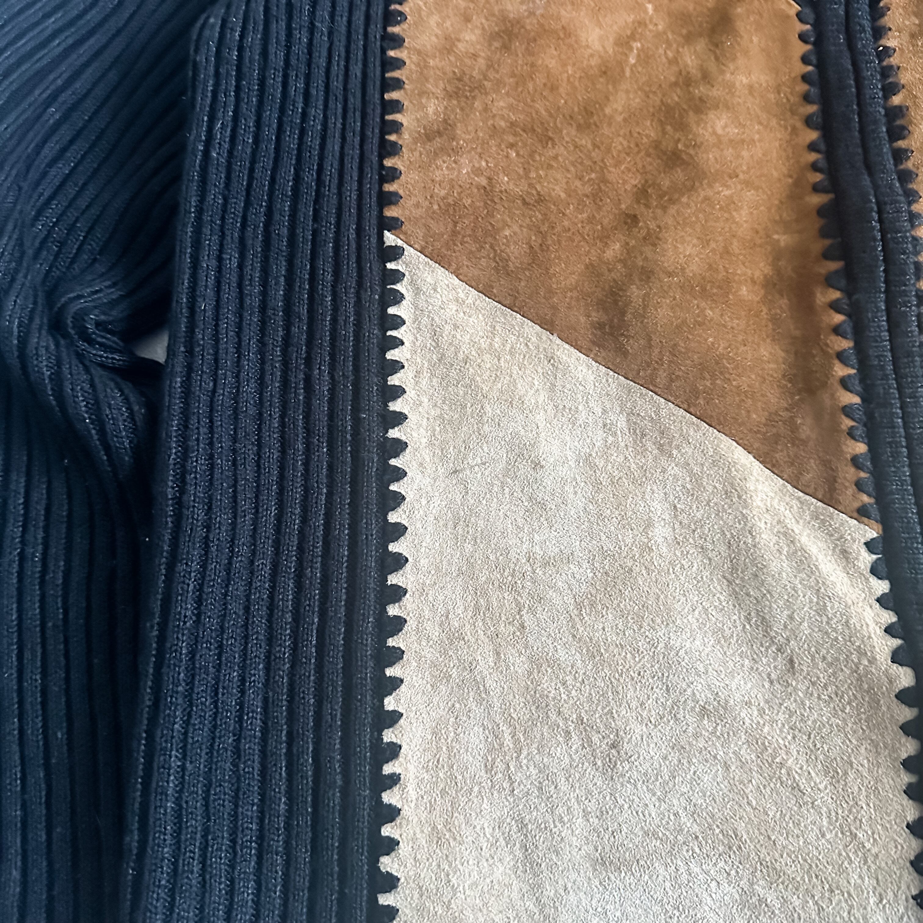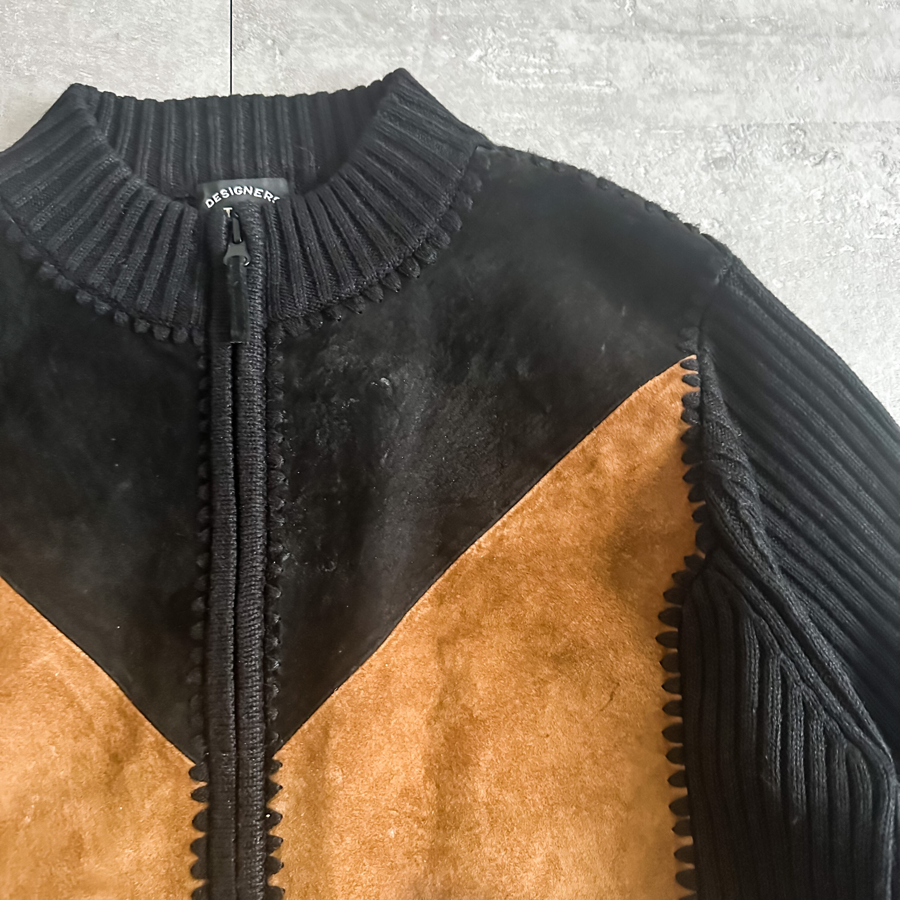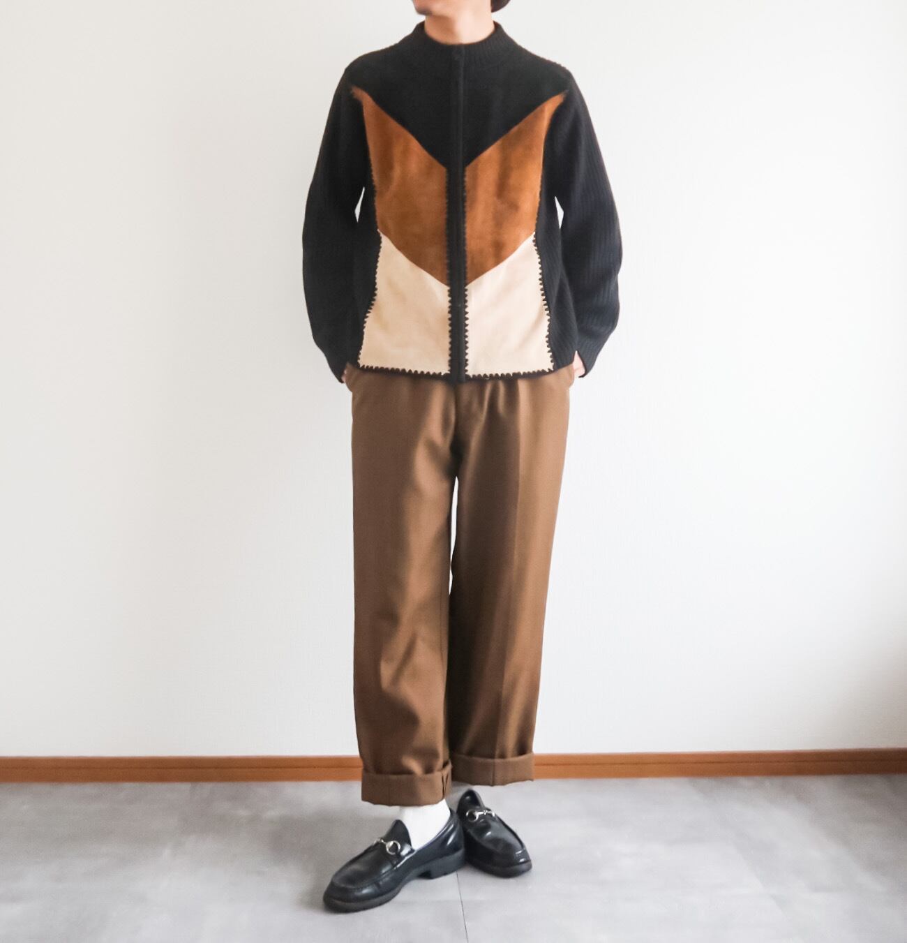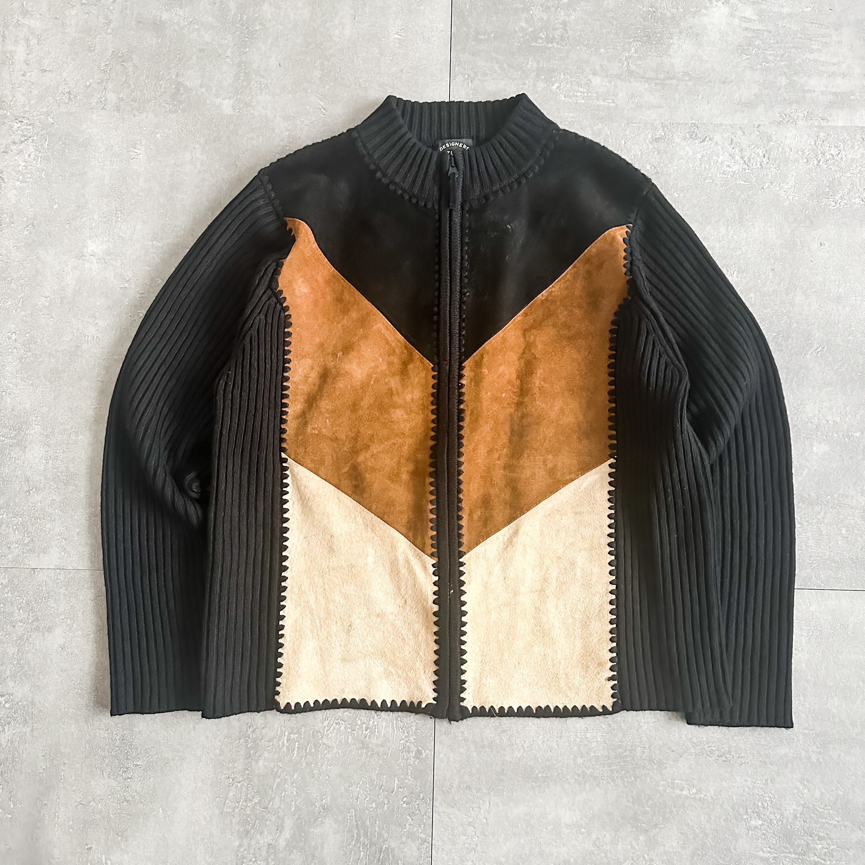 フルジップで少し高めの襟にフロントが3色のジェニュインレザー、それ以外がラミー×アクリルのニットに切り替わった非常に秀逸な珍しいデザイン。