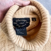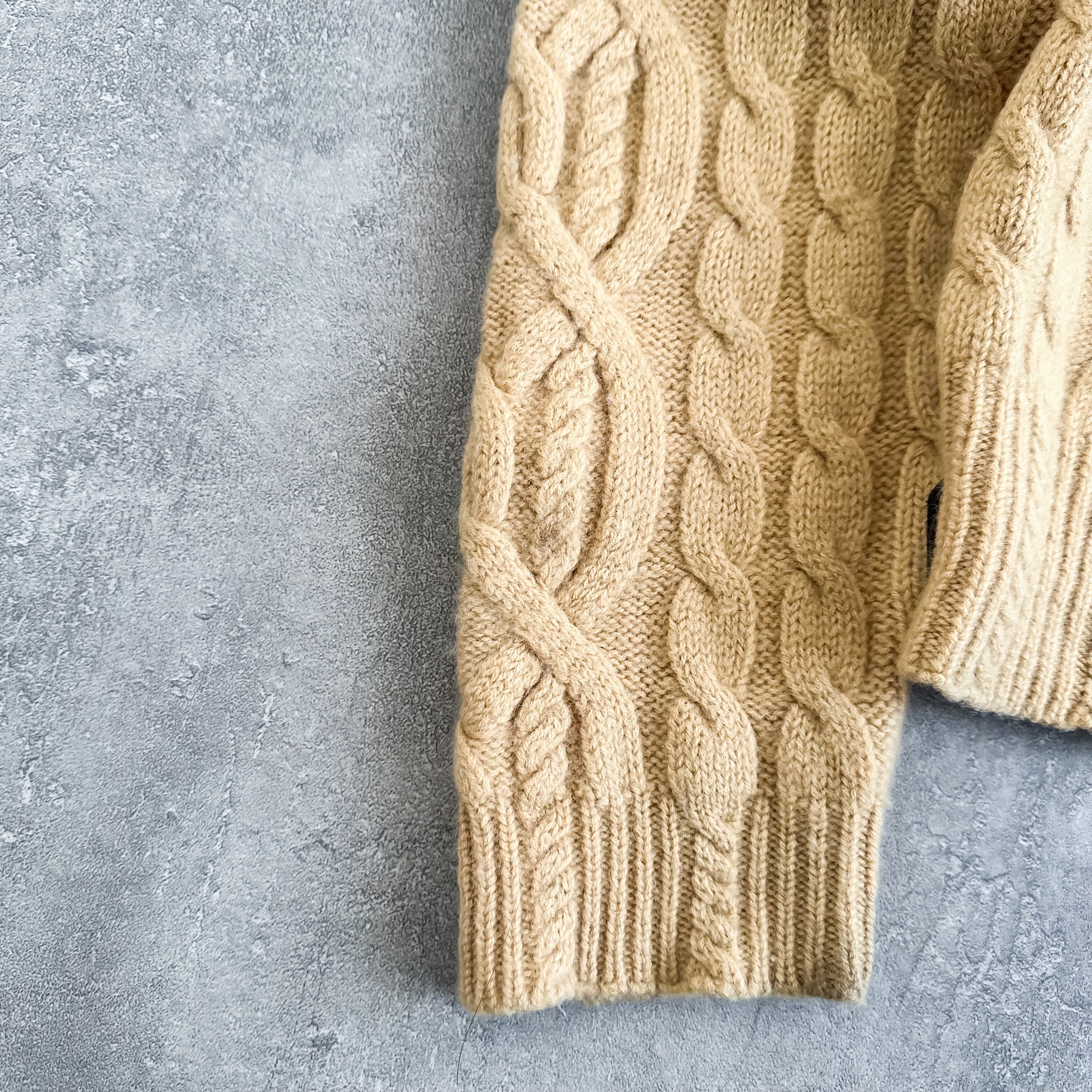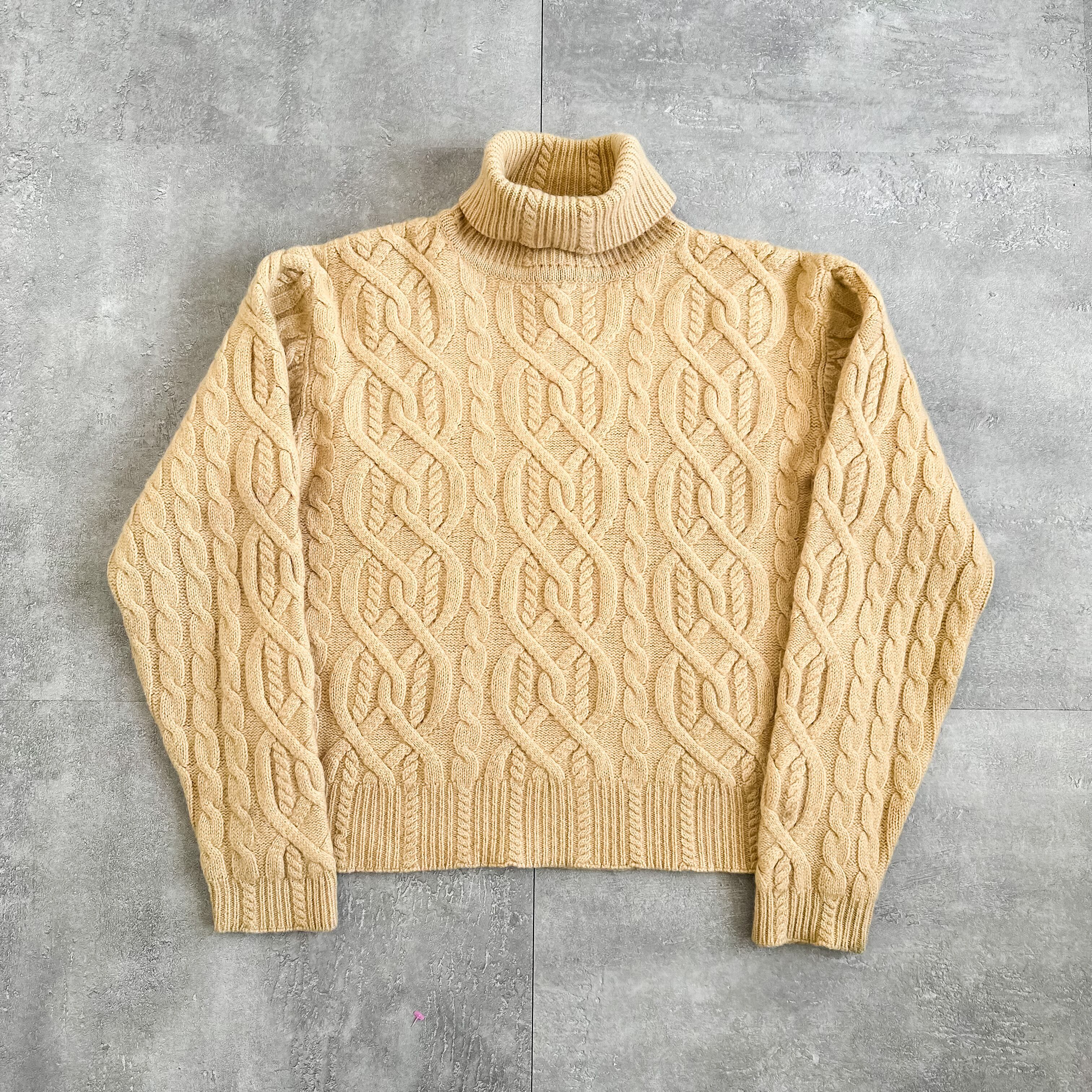 ベージュ系のカラーリングに、ケーブル編みのパターンと首元まであるタートルネックデザイン。