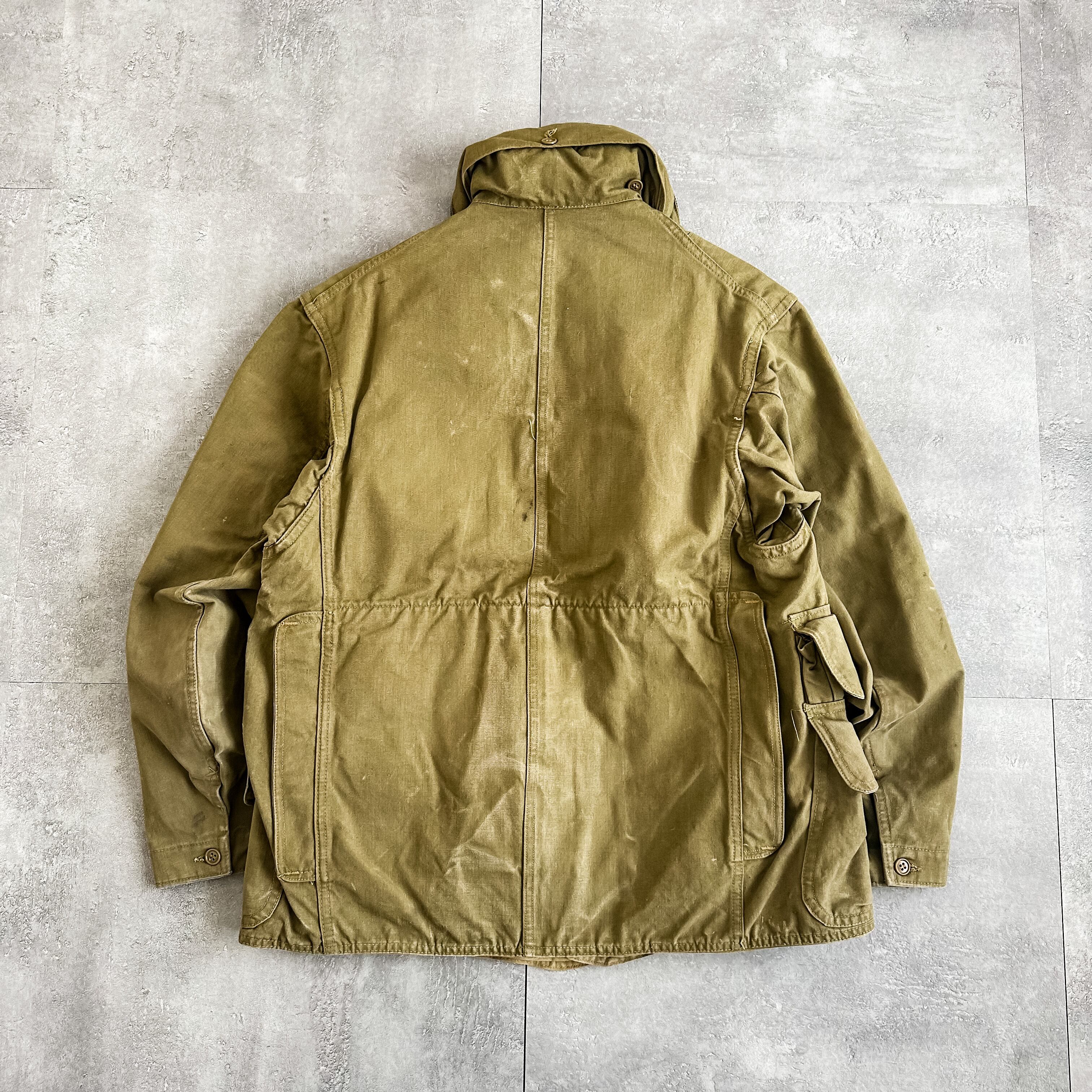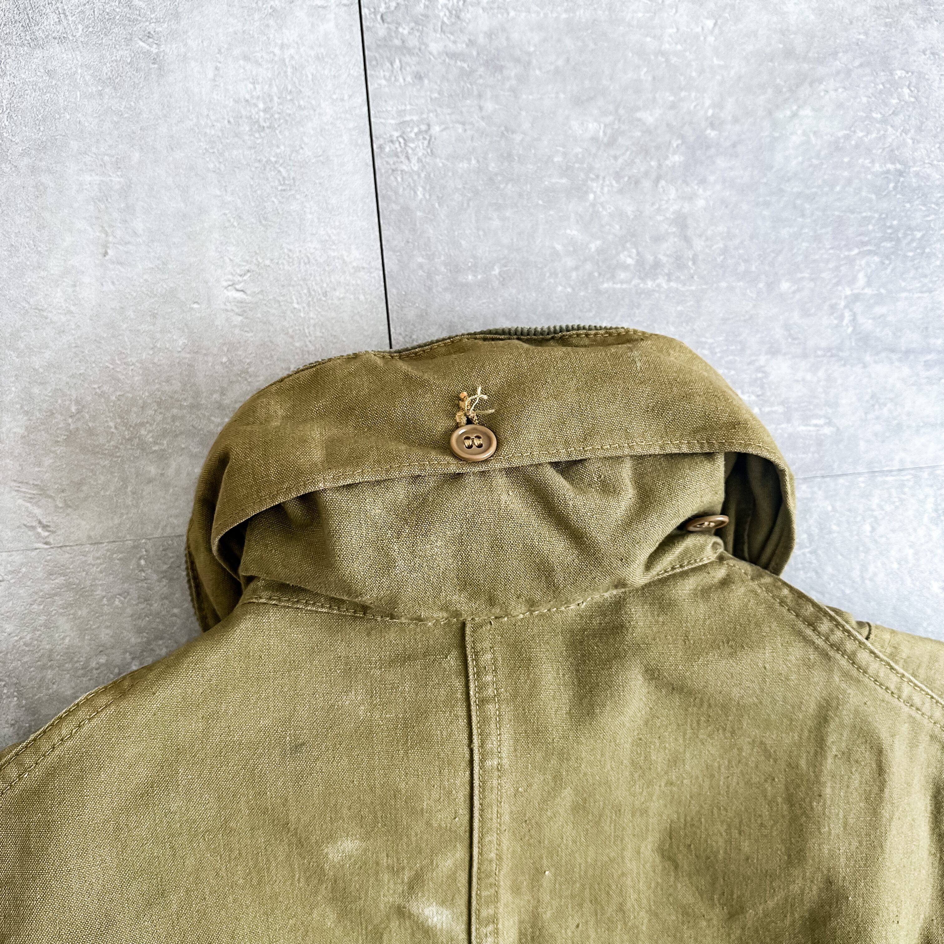 オリーブ系のカラーリングに、収納式のフードとチンストラップが付くハンティングジャケットの中でも珍しいディテールの個体になります。