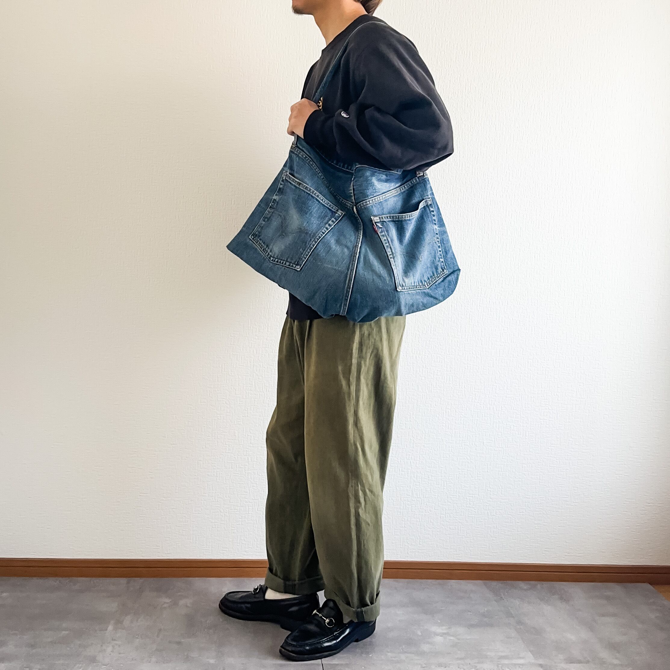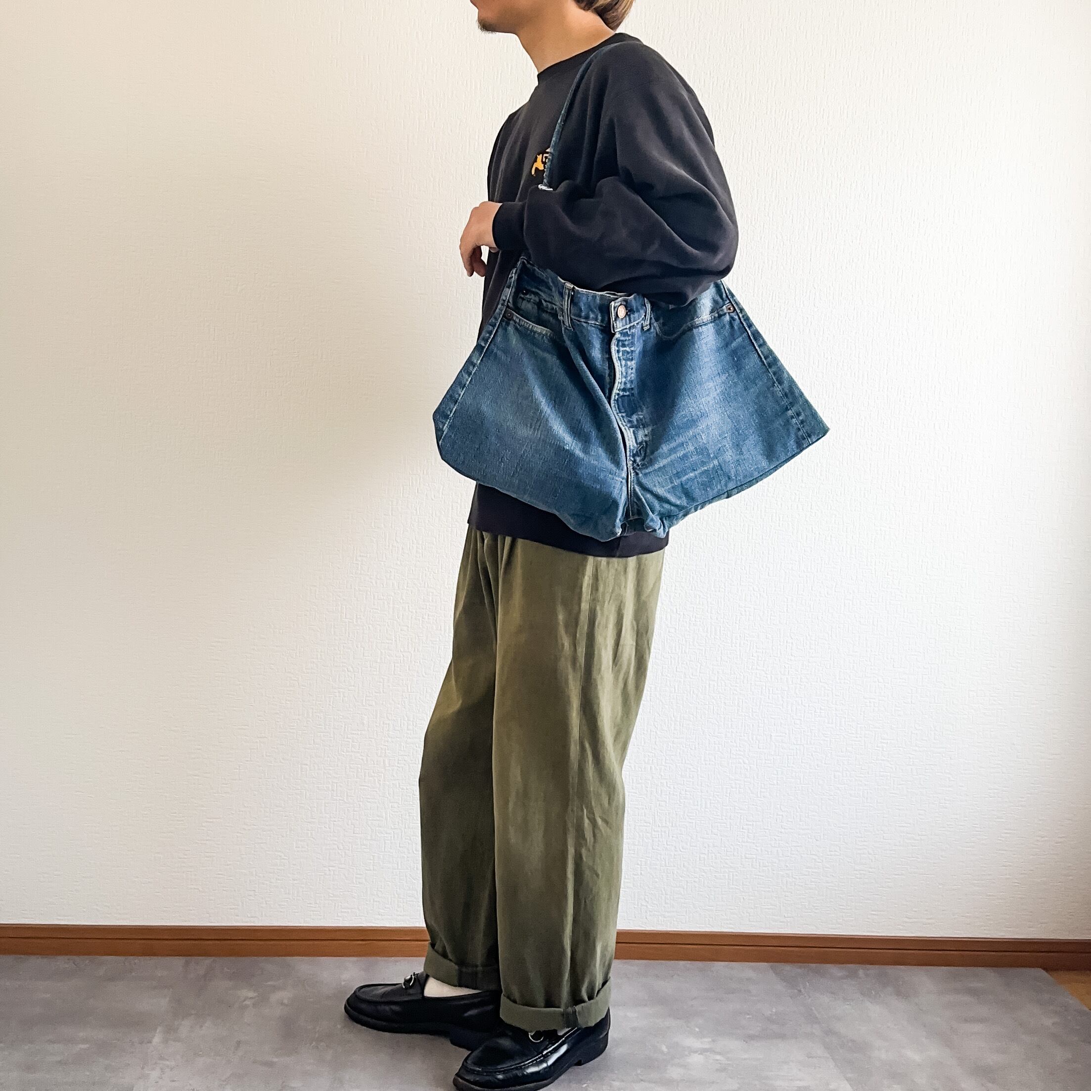 なかなかデニムパンツをリメイクしたバッグは見ないかと思いますのでコーディネートのアクセントになるかと。
