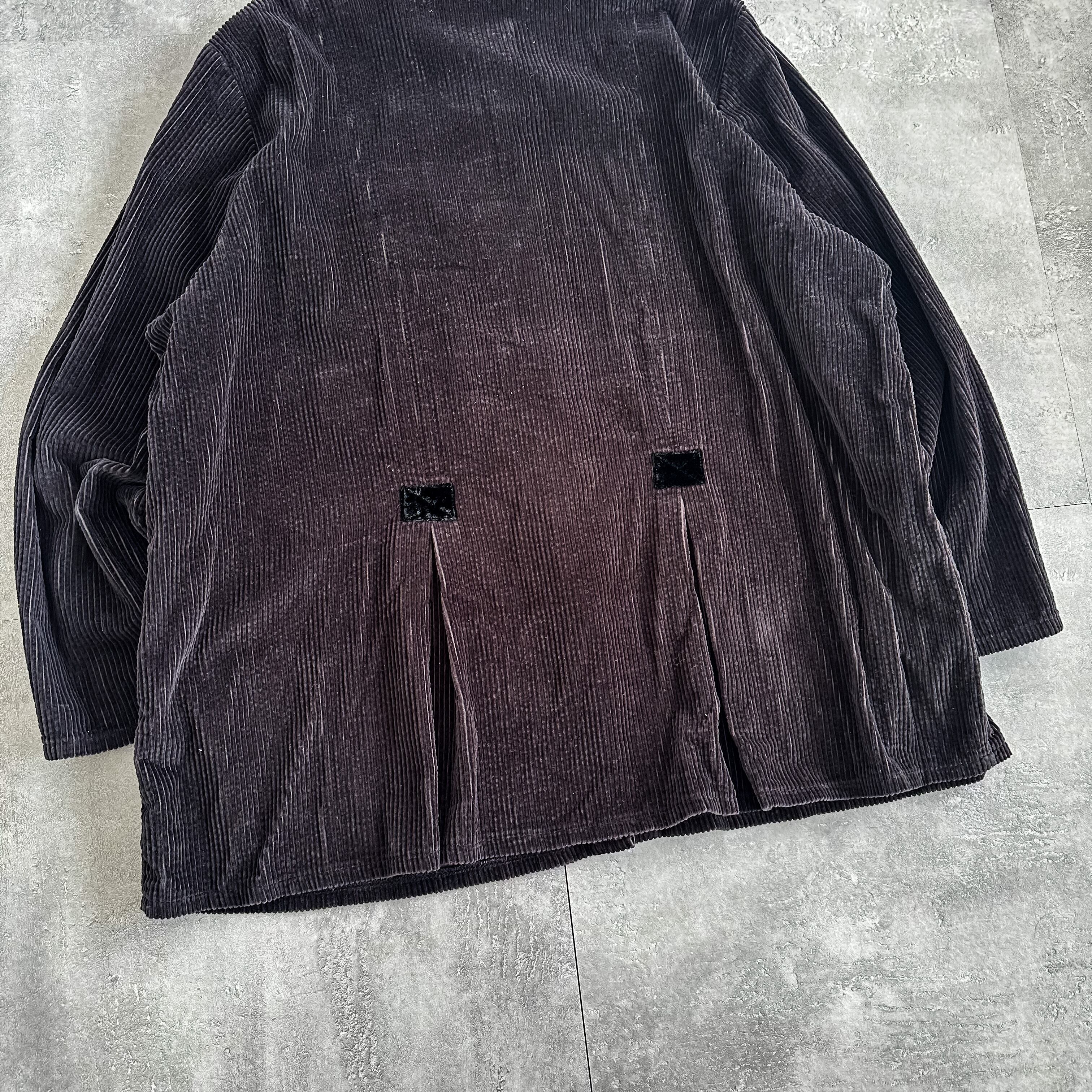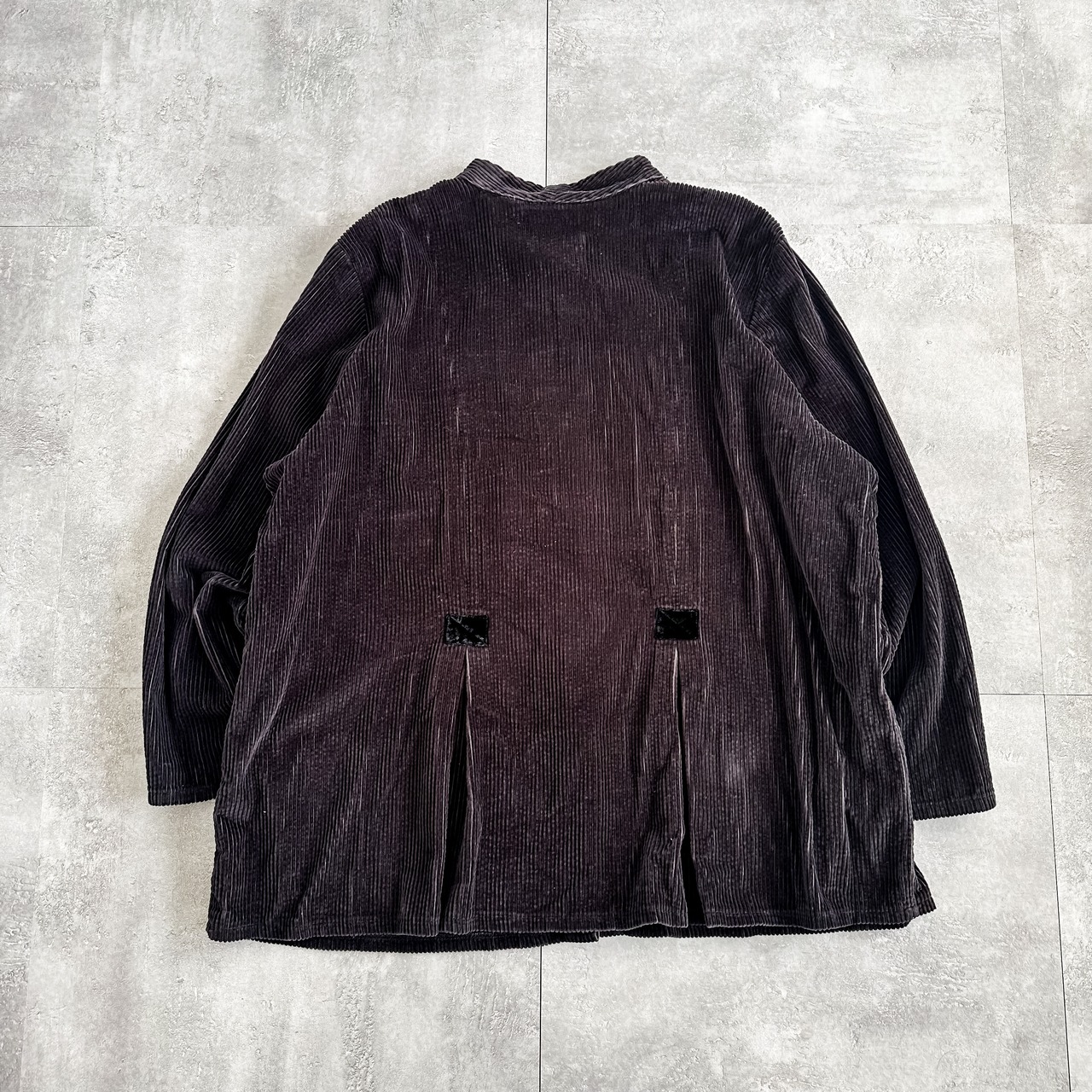 ブラックカラーの太畝コーデュロイに襟周りはスッキリしたバンドカラー、そしてポケットやバックのプリーツ上部にはベロアのパイピングデザインが施された素晴らしい逸品。