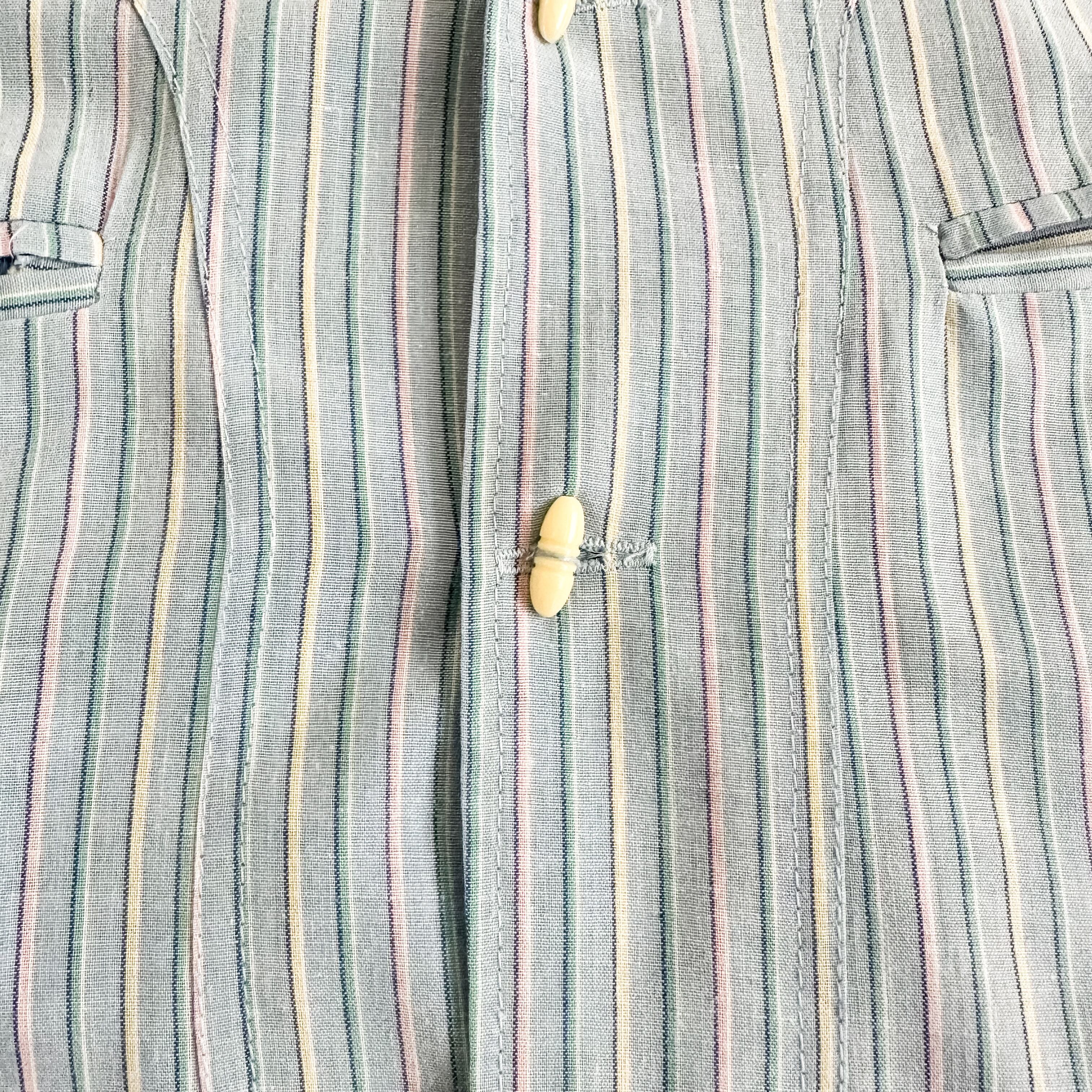 コットン×ポリエステルの混紡ファブリックに、青みのあるグレーにイエローやピンクの珍しいカラーのストライプ柄。